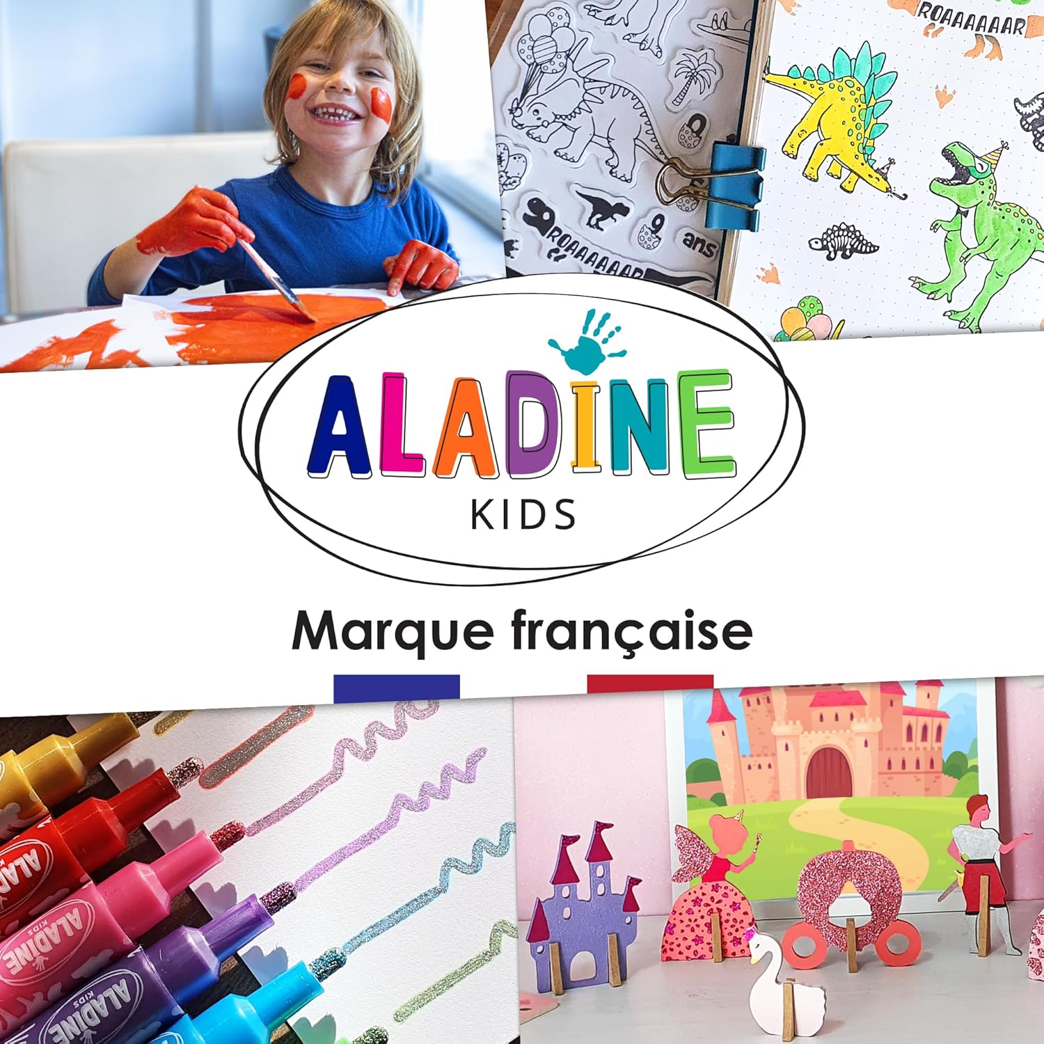 Product Description ✔ This complete kit consists of 10 "farm animals" theme stamps and an extra large, fast drying and washable ink. ✔ Tampons are a must for children's manual activities. Fostering imagination and creativity, children (and adults) appreciate the magical little side of stamped drawing that they can personalize with their sets, stories and colours. ✔ Ink meter diameter: 9 cm, color: black. ✔ These easy-to-use foam pads have been specially designed for children. The rubber impression is cut around the pattern for a design without unsightly border markings. ✔ All the designs of our stamps are original and made in France by the illustrators at the Aladine workshop. ✔ Aladine Minos tampons comply with toy regulations with EN 71. ✔ Your child has stamped pretty patterns on his arm or t-shirt? No problem, the ink can be washed with water and soap. On fabrics, remember to clean before the ink dries. After use, we also advise you to wash your tampons immediately under water and with soap (a little dishwashing liquid) and dry them for a new session with tampons as new! ✔ No need to stamp in several places, the inker is large enough to ink the entire pattern. Ready to use and ready to offer, this kit is the ideal gift for all young budding artists. From the Manufacturer Tampominos Stamp Sets from Aladine are specifically designed for 3-5 year olds. These larger stamps are easier to handle and show the picture design on the back for the children to see. This adorable set of 10 stamps featuring farm animals and their babies will be fun to use not only for craft projects but also when your child is learning the names and sounds of animals. . Specially made for the young hands. This set also includes a washable ink pad.